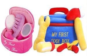 A sinistra una trusse rosa con pettine, specchio e rossetto con la scritta che contiene oggetti imbottiti a forma di rossetto, braccialetto, specchio e chiavi. La borsa, inoltre se premuta, canta una canzoncina sui colori rosa e porpora. La versione per maschi di questo giocattolo, a destra, ha la forma di una cassetta per attrezzi. Gli oggetti imbottiti sono martello, cacciavite, sega, chiave inglese, e la scatola canta una canzoncina differente: “Andiamo al lavoro!”. Se li osservo con questo sguardo questi affettuosi giocattoli mi sembrano un po’ meno ingenui e innocui: il messaggio è chiaro e crescendo gli stereotipi di genere vengono sempre più affermati in distinte categorie. I maschi sono educati fin da piccolissimi ad essere intraprendenti, autonomi e ad affermarsi nella vita col lavoro. Le femmine a prendersi cura di sé e delle faccende domestiche, ad essere servizievoli e a sognare il principe azzurro. Questi ruoli non sono affatto naturali o iscritti in un codice genetico, ma appresi attraverso rinforzi culturali continui che alimentano un processo economico globale. Produttori diversi riproducono ossessivamente gli stessi concetti. Esiste un nesso tra la precoce educazione agli stereotipi di genere e comportamenti discriminatori e sessisti fino alle molestie sessuali sulle donne? Ne parlava anni fa Elena Gianini Belotti in ‘Dalla parte delle bambine’, un testo che fece storia e più recentemente in un altro che ne riprende le intuizioni dal titolo ‘Ancora dalla parte delle bambine’ ,la giornalista Loredana Lipperini sostiene che ben poco sia cambiato nonostante le lotte di emancipazione e la nostra pretesa modernità. Il potere di questi silenti modelli culturali è evidente ad esempio quando vengono disattesi o trasgrediti, che diremmo di un bambino che ama i trucchi e di una bambina appassionata dall’avvitare e riparare? Vedere le implicazioni di ruoli stereotipati di genere sui comportamenti e nelle relazioni educative che vengono veicolati nei comportamenti quotidiani, è il primo passo per cambiarli e capirne le trasformazioni.