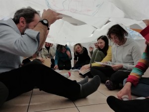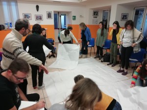 Nello spazio al centro della stanza sono distesi grandi fogli di carta velina bianca che evocano un grembo materno. Ci disponiamo a nascere seduti attorno.