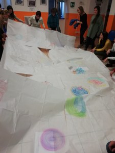 Poi ci facciamo grembo, utero, ventre. Per ascoltare le storie delle nostre nascite alziamo delicatamente e tutti insieme il grande foglio di carta velina fino a ripararci sotto, come una grande e delicata coperta. Che sorpresa, è tiepido e la luce vi filtra soffusa! Qualcuno mentre ascolta, si accuccia.
