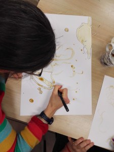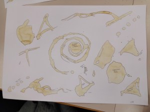 Partiamo dal gesto, spargiamo caffè , usando il cucchiaino come pennello, pasticciando con i confini del foglio.