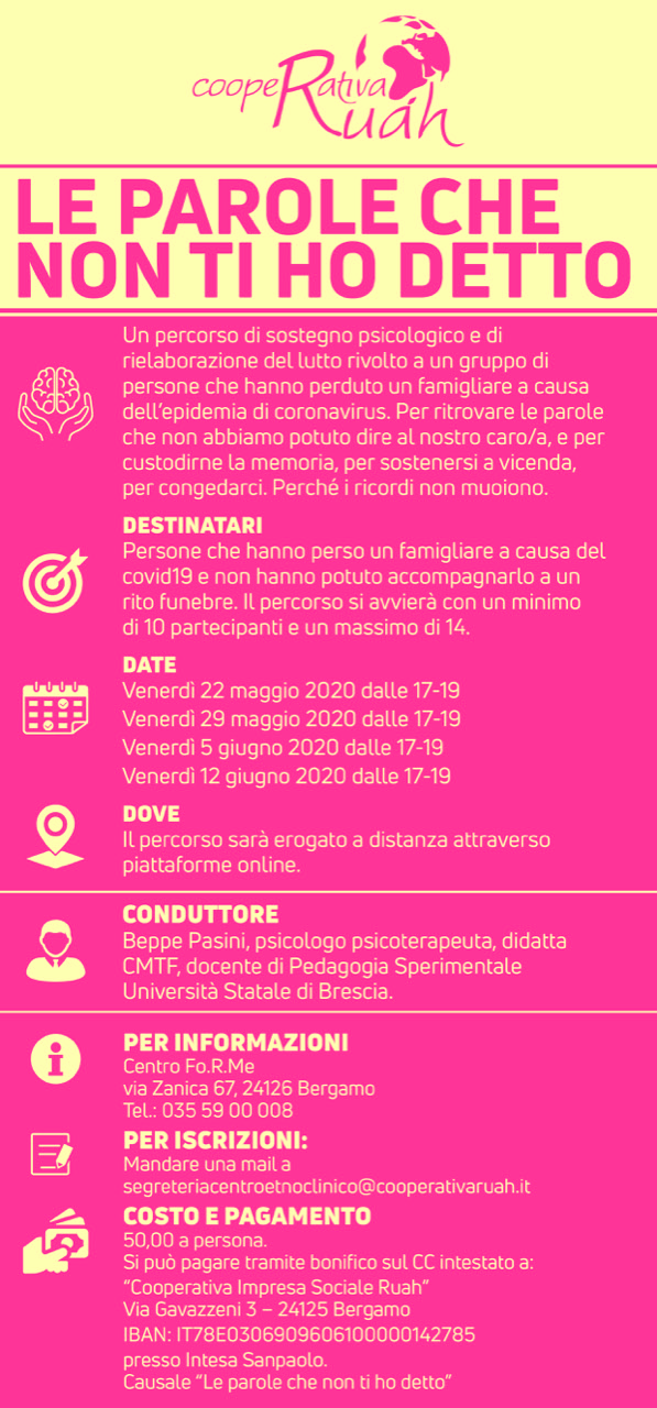 Un percorso di sostegno e accompagnamento rivolto a persone che hanno perso un famigliare durante la quarantena a causa del Covid 19 e non hanno potuto celebrare un rito. Per ritrovare le parole, per custodire la memoria, per congedarci. In collaborazione con la cooperativa Ruah di Bergamo. Perche’ i ricordi non muoiono.