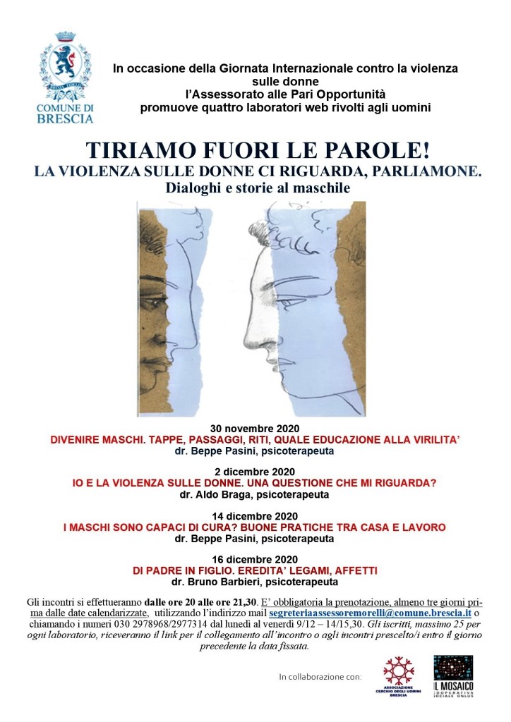 La violenza sulle donne ci riguarda. In quanto persone, figli, padri, fratelli, compagni, mariti, insegnanti, educatori. Come maschi ci sentiamo coinvolti e partecipi della lotta che le donne di ogni latitudine e appartenenza, hanno da tempo intrapreso contro la violenza di genere e il femminicidio, verso un necessario e non più rinviabile cambiamento culturale. Per  una  relazione tra i generi basata sul  rispetto, sul reciproco riconoscimento così come sul contrasto alla  violenza in ogni ambito della vita civile e sociale, nelle scuole, in famiglia, sul lavoro, nelle relazioni comunitarie. E’ tempo di tirare fuori le parole, attributi importanti e quantomai necessari per riflettere, rielaborare, raccontare, condividere il nostro punto di vista a partire da noi stessi, vero antidoto all’indifferenza e alla cultura sessista e prevaricatrice. Per rivendicare anzi  la bellezza e la specificità di un sapere e una cultura della cura, dell’accudimento, della solidarietà, della capacità di dialogo al maschile. Aldilà di sterili vittimismi o colpevolizzazioni.