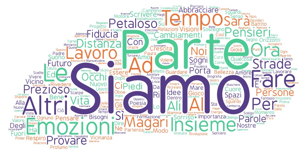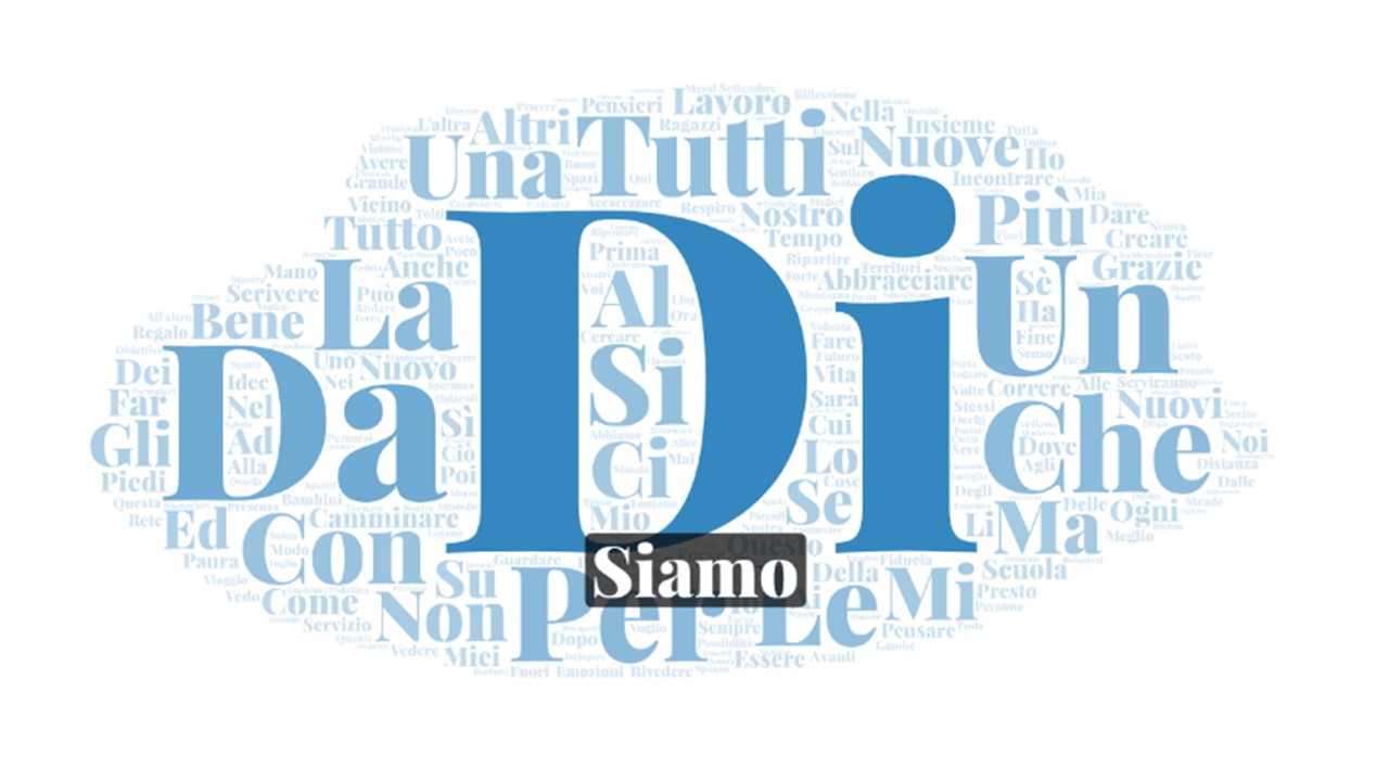 Ciao a tutti/e! grazie ancora di questa bella occasione per incontrarci stasera anche a distanza. Quando l’amico Massimo Serra mi ha coinvolto nel percorso di LHQ mi sono chiesto fin dall’inizio quale contributo avrei potuto dare al vostro lavoro. In questo periodo ho ricevuto il materiale che avete prodotto negli incontri con Max e Alessandra e nelle ‘merende’. Ho visto una comunita’ di persone che si prende cura attraverso la condivisione, la riflessione , l’invenzione di metafore, l’ascolto di storie e di esperienze. Azioni che in questo periodo, sono cosi importanti e di aiuto per quanti come noi svolgono un lavoro di cura. Mi sono arrivate soprattutto le vostre parole, tantissime, Mi son detto: che ci posso fare con tutto questo bendiddio? Cosi per l’incontro di stasera ho pensato di metterle tutte in un sacco e di farne una bella nuvola che mi è sembrata una immagine da don Chisciotte, da visionari di mulini a vento, un po’ romantica anche, ed e’ venuta fuori questa meraviglia che volevo mostrarvi! Le parole piu grandi sono quelle che ricorrono di piu. Belle eh?