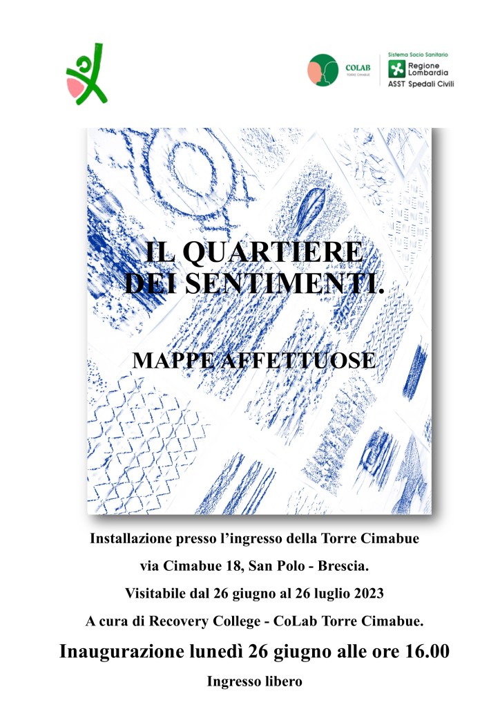 Presso l’ingresso della torre Cimabue di Sanpolo via Cimabue 18 (Bs), esito di un percorso laboratoriale itinerante guidato da Beppe Pasini, docente di pedagogia presso l’Università Statale di Brescia e un gruppo di utenti e cittadini della rete CoLab, progetto innovativo per la salute mentale col patrocinio di Ospedali Civili di Brescia. Si tratta di tre mappe simboliche che attraverso parole, immagini, tracce esplorano il quartiere da punti di vista inediti e invitano a considerare il territorio non solo nelle sue dimensioni materiali, ma anche emozionali, affettive, poetiche.
